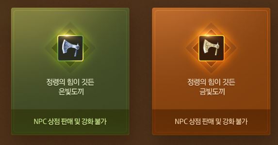 '정령의 힘이 깃든 은빛도끼'와 '정령의 힘이 깃든 금빛도끼'를 확인해보세요.