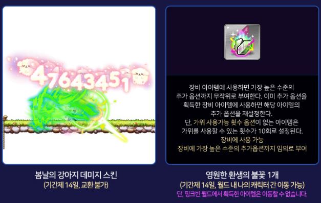 봄날의 강아지 데미지 스킨과 영원한 환생의 불꽃을 받아보실 수 있습니다.