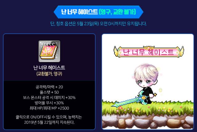 옵션은 5월 23일까지만 사용 가능하며 옵션 유지 기간이 지나면 옵션은 모두 사라지고 칭호만 남게 됩니다.