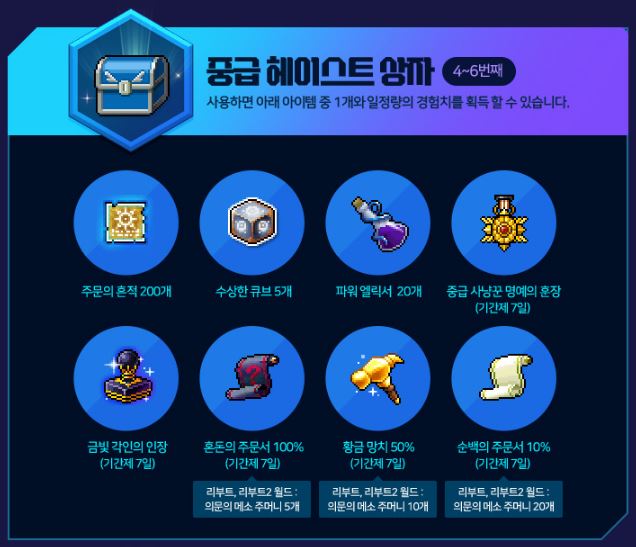 하급, 중급, 상급, 최상급 헤이스트 상자로 높은 등급의 상자일수록 보상은 더욱 좋아지겠죠?