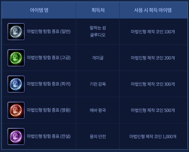 다양한 마법인형 탐험 증표는 획득처가 각각 다른데요.