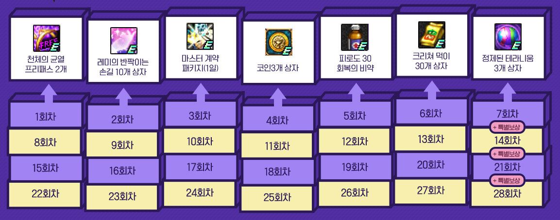 7회차 / 14회차 / 21회차 출석체크를 완료하면 특별 보상까지 추가로 지급된다고 하네요.