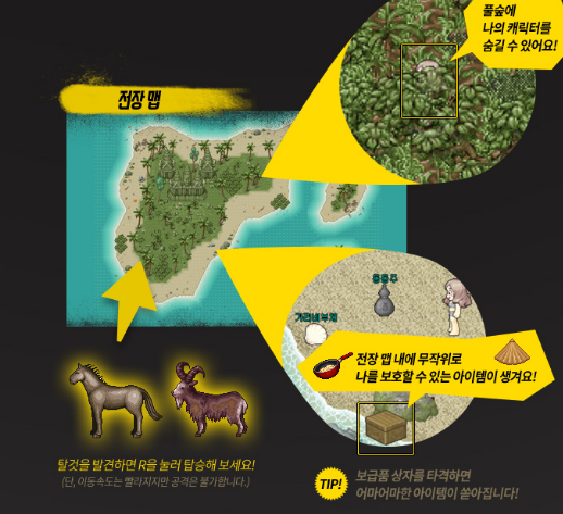 전장 맵에서는 풀 숲에 숨어 적에게 나를 숨길 수도 있고