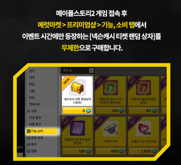 이벤트 시간에만 등장하는 [넥슨캐시 티켓 랜덤상자]를 무제한으로 구매합니다.
