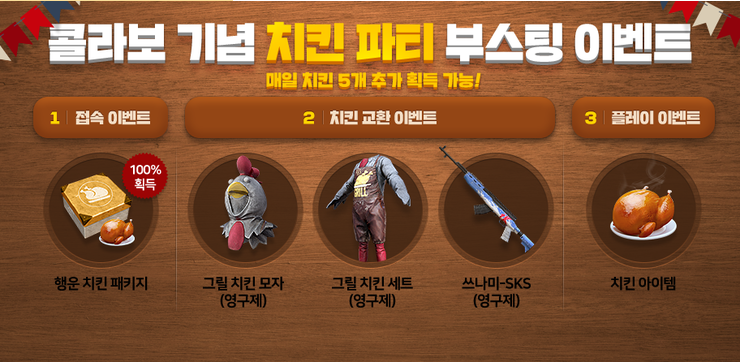 이번 이벤트는 그릴 치킨 모자,세트와 스크스(sks) 총기 스킨을 얻을 수 있는 이벤트 입니다.