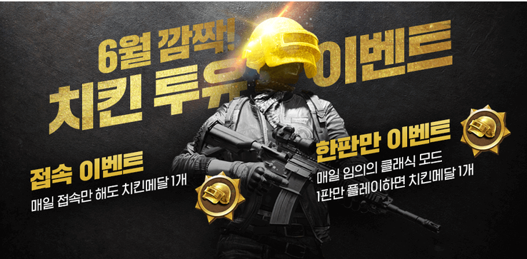 어려운 조건도 아니고 접속하신 후 한 판만 플레이하시면 치킨메달 2개를 얻을 수 있는 간단한 이벤트 입니다.