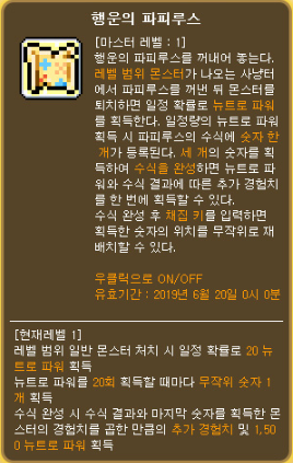 행운의 파피루스를 활성화 하고 몬스터를 사냥하면 일정 확률로 20뉴트로 파워를 획득하게 됩니다.