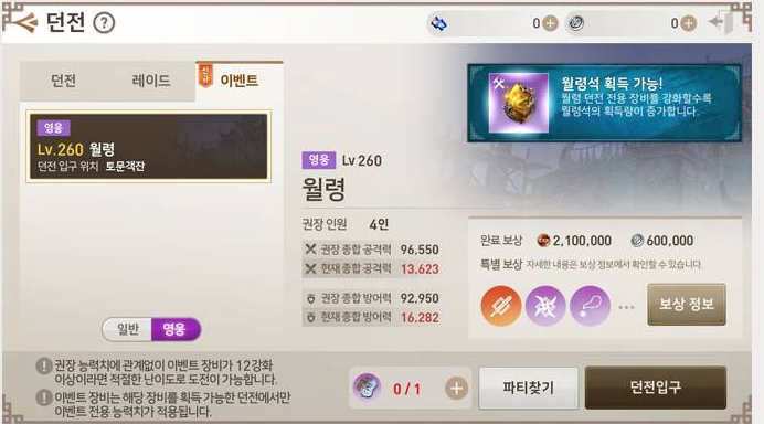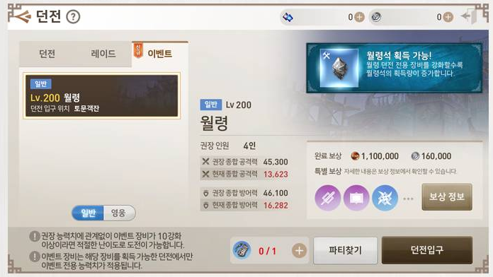 위쪽에서 설명드렸듯이 이벤트 던전 월령은 일반, 영웅 난이도로 구분할 수 있습니다.