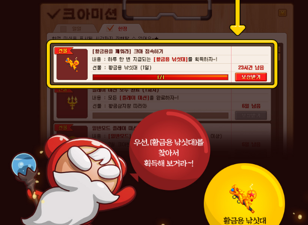 크아미션 → 한정미션에서 황금용 낚싯대를 받아보실 수 있는데요.