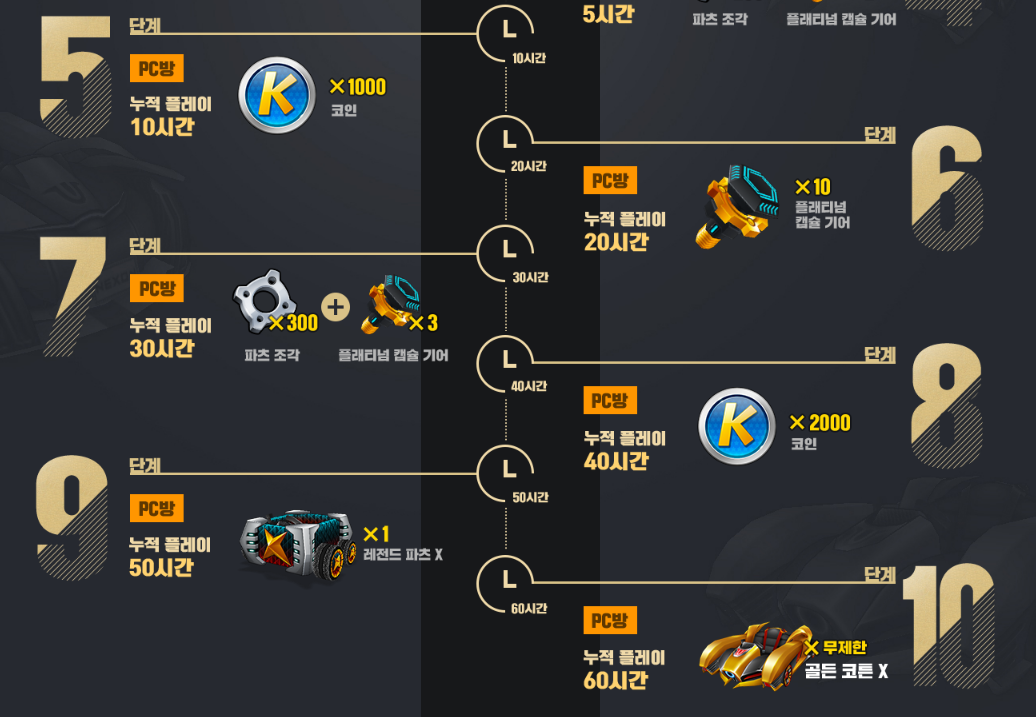 총 60시간을 10단계로 나눠서 각 단계에 해당하는 플레이 시간만큼 플레이를 하면 보상을 받아보실 수 있습니다.