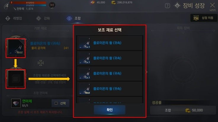 먼저 조합에 사용할 장비를 선택한 후, 일반 ~ 고급까지 장비는 동일한 등급 및 아이템을