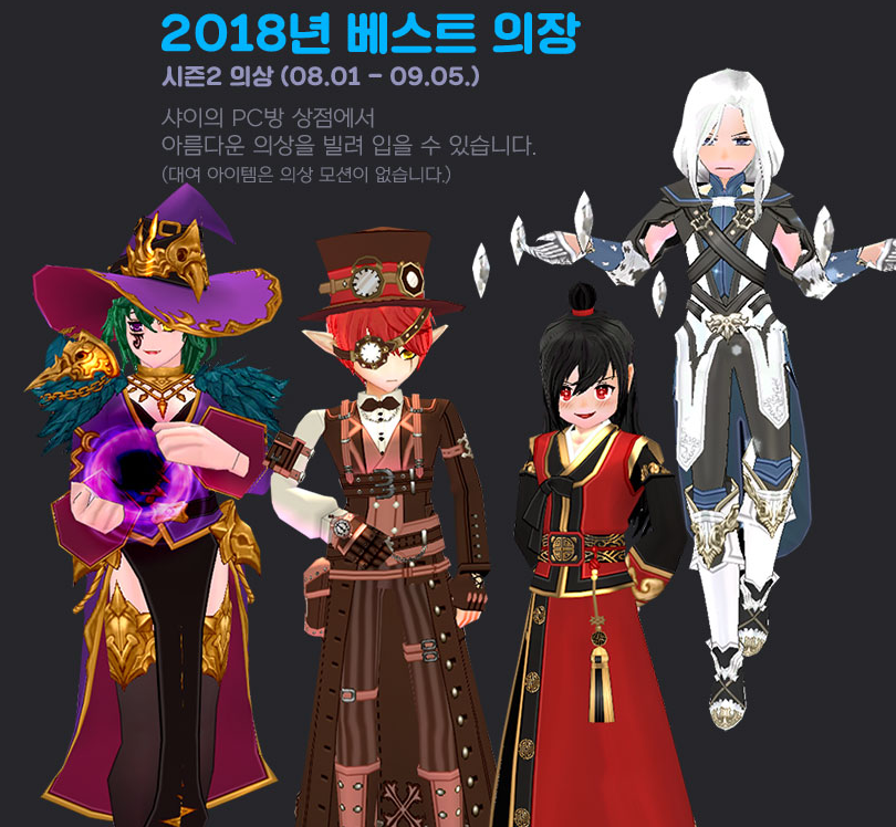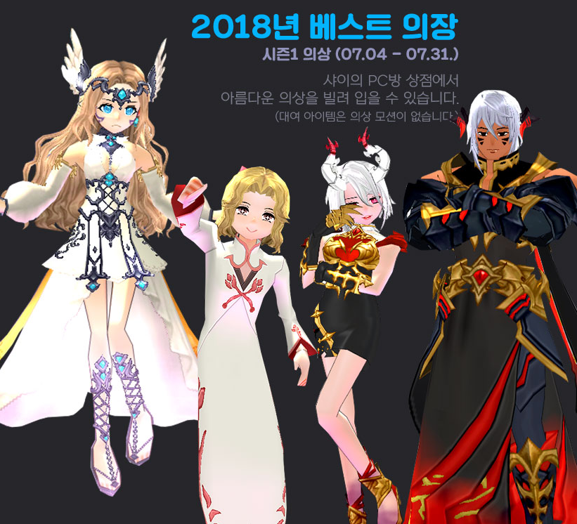 의상은 2018 베스트 시즌 1의상 시즌2 의상으로 총 8종의 의상이 대여 가능합니다.