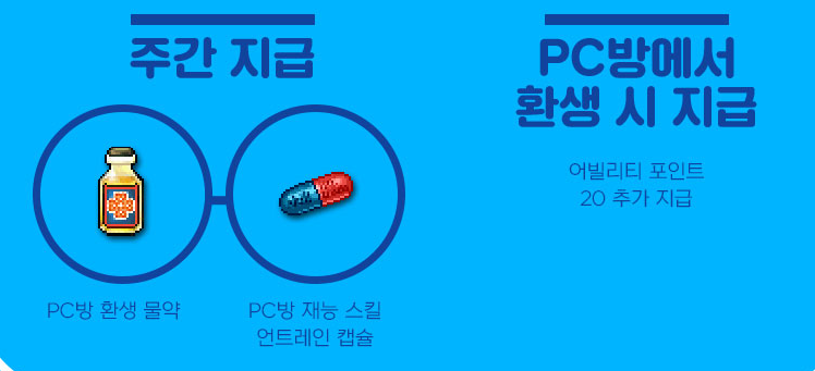 주간 지급 보상으로는 PC방 환생물약, PC방 재능 스킬 언트레인 캡슐을 지급하며
