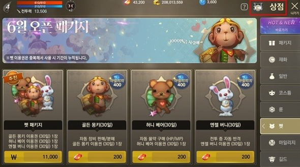 허니 베어의 기능은 물약 소진 시 100개 자동구매하는데요.