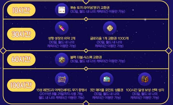 10시간, 30시간, 60시간, 100시간 간격으로 보상을 받아보실 수 있는데요.