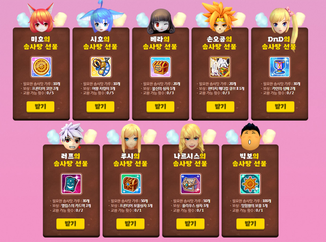우선 슈가 몬스터 맵을 플레이하여 승리하게 되면 승리 1회당 20개의 솜사탕 가루를 획득할 수 있습니다. 이 솜사탕 가루는 하루에 최대 100개까지 획득해보실 수 있답니다. 그리고 이벤트 페이지에서 미호, 시호, 베라등 다양한 캐릭터들에게서 상품을 교환하면 되는데요. 다양한 보상이 있으니 필요하신 보상을 선택하셔서 교환해보시면 되겠습니다.