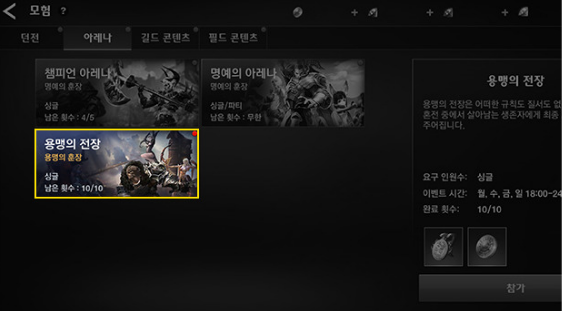용맹의 전장의 크게 레벨 제한이 없고 메인 화면의 우측 상단을 통해서 진입이 가능합니다. 용맹의 전장은 월, 수, 금, 일 오후 6시 ~ 12시까지 오픈되어 있으며 하루에 최대 10회까지 입장이 가능합니다. 매 라운드마다 최대 10명의 유저와 대전하게 되며 대전은 모두 동등한 전투력으로 매칭에 되니 어느정도 컨트롤 싸움이라고 생각사히면 되겠습니다.