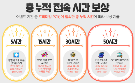 다음은 총 누적 접속 시간 보상에 대해서 알아보도록 할게요. 우선 총 누적 접속 시간 보상은 그래도 지난 번에 비하면 절반 정도 줄어들어 최종보상은 50시간만 달성하면 덛을 수 있습니다. 거두절미하고 최종 보상부터 알아보자면 바로 프리미엄 칭호와 3만 메이플포인트를 획득해보실 수 있고, 그 외에도 블랙 큐브, 로얄 성형 쿠폰, 경험치 2배 쿠폰도 획득해보실 수 있겠습니다.