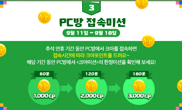 다음은 PC방 접속 미션이에요. 추석 연휴 하루 전인 9월 11일 ~ 9월 18일까지 연휴 기간동안 PC방 접속 시간에 따라서 크아포인트를 획득해보실 수 있는데요. 60분 플레이시 1000CP, 120분 플레이시 2000CP, 180분 플레이시 3000CP를 획득할 수 있다고 하는데요. 아마 하루에 3시간을 플레이하면 총 6000CP가 아니라 3000CP만 얻어보실 수 있을 것 같아요.