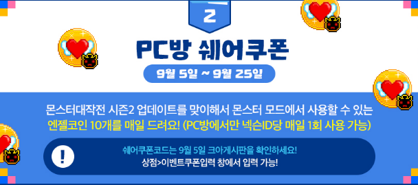 두 번째 이벤트는 PC방 쉐어 쿠폰이에요. 몬스터대작전 시즌2가 최근에 업데이트 되었는데요. 이를 맞이해서 몬스터 모드에서 사용할 수 있는 엔젤 코인을 매일 10개씩 받아보실 수 있습니다. PC방에서만 넥슨ID당 매일 1회 사용 가능하다고 하는데요. 넥슨 ID를 붙이는 것을 보니까 네이버 채널링 아이디는 안될 듯 합니다.