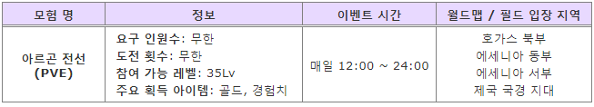 이번 업데이트로 신규 직업 창기사와 함께 필드 콘텐츠인 신규 모험 아르곤의 전선이 추가됩니다. 아르곤의 전선은 경험치와 골드 던전으로 매일 정해진 시간에 도전 횟수 제한 없이 혼자 or 파티를 이루어 입장하실 수 있습니다. 아무래도 빠른 성장을 원하신다면 이제 아르곤의 전선을 플레이해보시는 것도 좋을 듯 하네요.