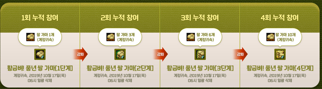 이 쌀가마니를 획득하실 수 있는 방법은 각 주마다 참여를 하시면 되는데요. 1~4회까지 누적 참여시마다 가마를 받게되며 4주차를 모두 참여하신다면 풍년 쌀가마 4단계를 받게되는데, 이 쌀가마 4단계를 사용하면 쌀가마 10개를 획득하실 수 있어요. 그런데 쌀가마는 위 던전을 클리어해서 받은 쌀가마와 다르게 교환 불가이니 참고해두시면 좋을 듯 합니다.