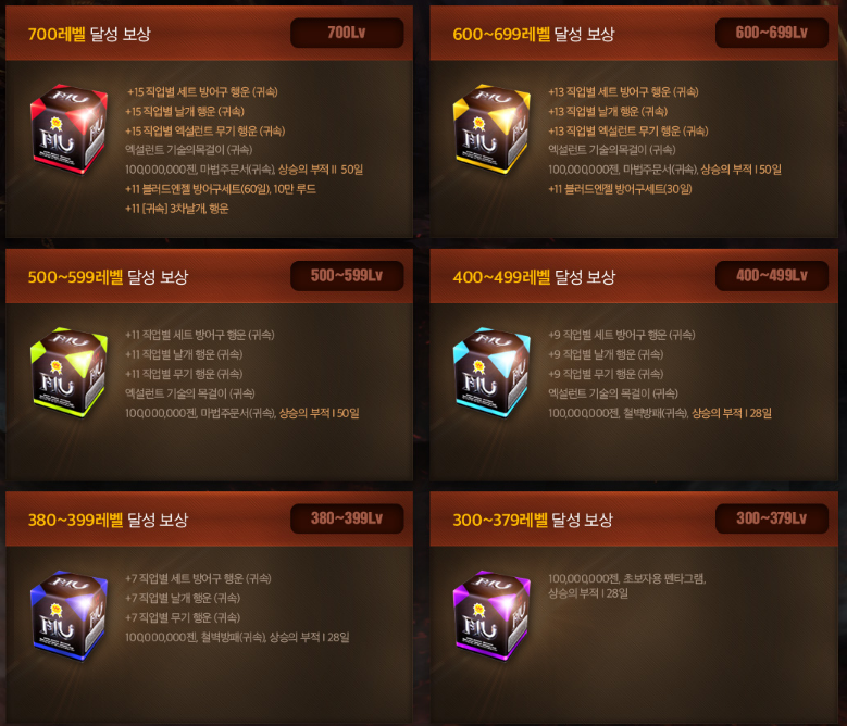 또 레벨 달성에 따라서 보상을 지급하게 됩니다. 300레벨 ~ 700레벨까지 레벨 별 보상을 지급하게 되는데요. 보상으로는 제일 높은 등급인 700레벨 달성 보상으로는 +15 직업별 세트 방어구 행운, +15날개 행운 등등 정말 다양한 아이템을 획득해보실 수 있답니다. 이 보상을 받기 위해서는 역시 스피드 이벤트 서버에서 본서버로 서버 이전이 하면 최초 접속 시 인벤토리에서 확인해보실 수 있다고 합니다.