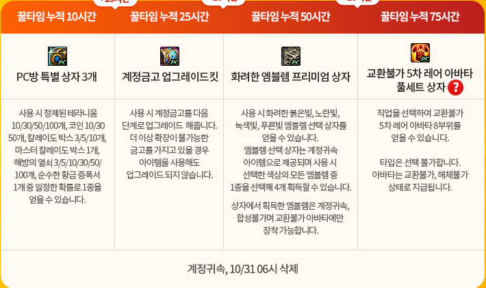 10시간에는 PC방 특별 상자 3개, 25시간에는 계정 금고 업그레이드킷, 50시간에는 화려한 엠블럼 프리미엄 상자, 75시간에는 교환불가 5차 레어 아바타 풀세트 상자를 받아보실 수 있겠습니다.