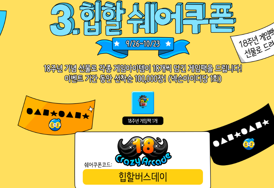 세 번째는 힙할 쉐어쿠폰으로 게임 아이템들이 18개식 담긴 게임팩을 쿠폰을 입력하시면 받아보실 수 있습니다. 쿠폰은 ' 힙할버스데이'이며 이벤트 기간동안 넥슨 ID당 1회 입력 가능하며 선착순으로 10만개를 배포하는데, 크아 유저들 수를 보면 10만개를 채울 수 있을지 의문입니다.