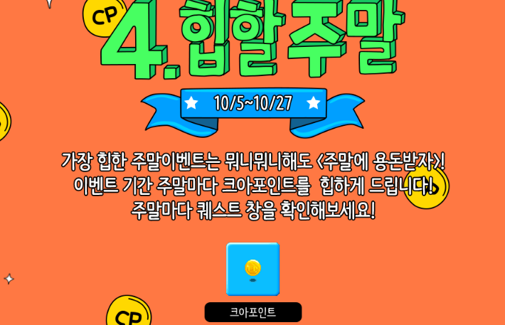 네 번째 이벤트는 10월 27일까지 진행되며 이벤트 기간동안 주말마다 크아포인트를 받아보실 수 있는 이벤트되겠습니다. 크아포인트는 주말에 퀘스트 창에서 확인해보실 수 있다고 하네요.