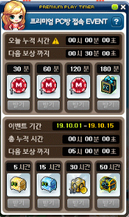 이번 이벤트는 2019년 10월 1일 ~ 10월 15일까지 진행되는 이벤트로 다들 알듯이 PC방에서 메이플스토리를 접속한 시간에 따라서 보상을 받을 수 있는 이벤트입니다. 여기서 PC방 접속 보상 이벤트 기간에서는 하루에 최대 5시간까지 밖에 누적이 되지 안는다는 점 참고하시면서 이번 이벤트 참여하시면 좋을 것 같습니다.
