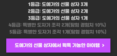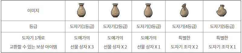 위에서도 말씀드렸듯이 도자기는 1등급 ~ 5등급까지 나오게 되고 높은 등급의 도자기는 당연히 더욱 좋은 보상으로 교환이 가능합니다. 1~3등급까지는 도예가의 선물 상자를 획득이 가능하고 4~5등급은 특별한 도자기 조각을 획득할 수 있는데요. 이때 특별한 도자기 도각은 NPC 상점에 팔면 탐험 경험치가 10% 증가하는 아이템으로 탐험 경험치가 필요한 경우를 제외하고 1~3등급을 얻어보시는 것이 좋겠네요.