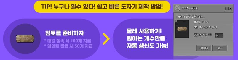도자기는 우선 매일 접속 시 100개 지급되는 점토를 준비하신 후 도자기 물레 작업대를 마우스 우클릭하여 사용하기 를 누르면 점토를 올려놓고 도자기를 제작할 수 있는데요. 이때 물래를 사용하여 원하는 개수만큼 자동생산도 가능합니다.이렇게 되면 도자기가 1~5등급까지 도자기가 나오게 됩니다.