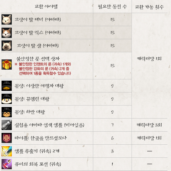 이렇게 퀘스트를 통해서 얻은 한글날 기념 동전은 전용 교환 상점을 통해서 10월 24일 오전 9시까지 다양한 아이템으로 교환하실수 있겠습니다. 보상은 고양이 탈 테비/믹스/샴, 불안정한 룬 선택 상자, 문양등 다양한 아이템을 획득해보실 수 있는데요. 각 아이템당 교환 보상이 있으니 미리 참고해주세요!