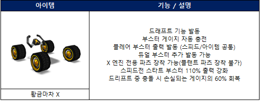 우선 신규 카트바디인 황금마차 X는 드래프트 기능 발동, 부스터 게이지 자동 충전, 플레어 부스터 출력 발동, 듀얼 부스터 추가발동, X엔진 전용 파츠 장착 가능 등등 다양한 능력을 가지고 있는데요. 그냥 기존의 X엔진들 카트바디와 비슷한 선능을 가지고 있다고 생각하시면 될 것 같습니다.