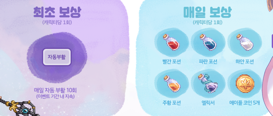 3번째 이벤트는 접속 보상이벤트인데요. 최초로 접속할 경우에는 경험치 및 레어 +50% 버프가 적용되고 1시간 경과시마다 버프가 강화되며 메이플 코인이 추가로 지급되는 이벤트랍니다.