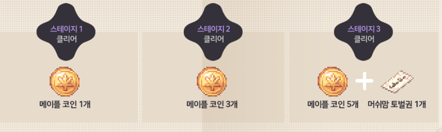 두 번재 이벤트는 메이플스토리 던전으로 핑크빈을 통해서 메이플스토리 던전으로 이동이 가능하고 1 ~ 3스테이지 클리어시에 메이플코인과 머쉬맘 토벌권을 받아보실 수 있는이벤트인데요. 위에서 진행했었던 퀘스트와 함께 참여해보시는 것도 좋겠습니다.