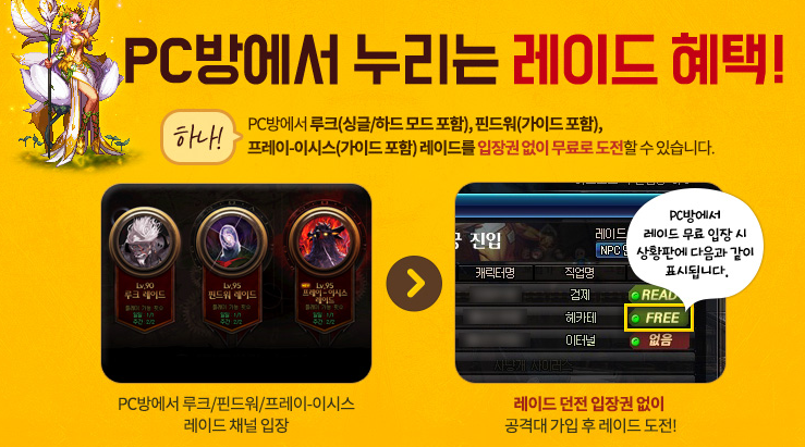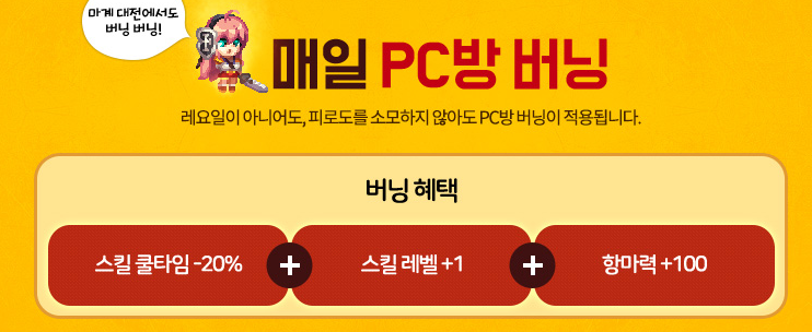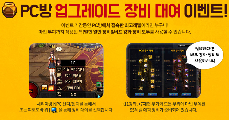 그 외에도 이전 PC방에서도 진행되었었던 PC방 업그레이드 장비 대여, 보너스 카드 2배 적용, 레이드 혜택, PC방 버닝 은 항상 진행되고 있답니다.