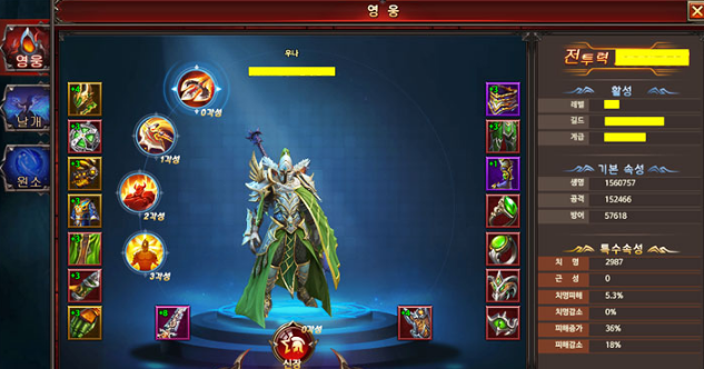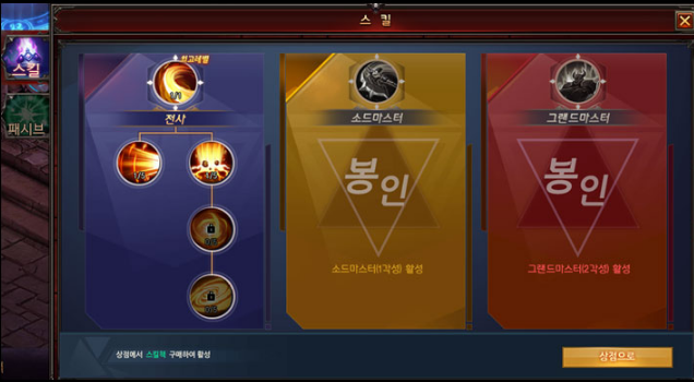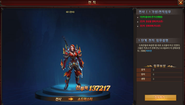 우선 처음에는 캐릭터를 전사로 생성하게 되로 레벨업을 하게되면 전직을 통해서 새로운 스킬을 배워나가는 식으로 점정 캐릭터를 육성해보실 수 있는데요. 각성을 하면할수록 장착할 수 있는 장비 탭이 증가하기 때문에 강해지기 위해서는 빠르게 레벨업을 해보시는 것이 좋습니다.