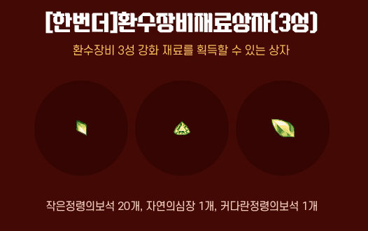 위 보상 외에도 원하는 환수/부위를 선택해서 14일 기간제 환수 장비를 획득해보실 수 있는 기간제 환수장비상자와 환수 3성 강화 재료를 확득해보실 수 있는 환수 장비재료상자를 획득해보실 수 있습니다. 환수장비 상자 같은 경우에는 800포인트에 환수 장비재료상자는 2000포인트에 획득이 가능하다고 하니 열심히 포인트를 모으셔서 보상과 교환해보시면 되겠습니다.