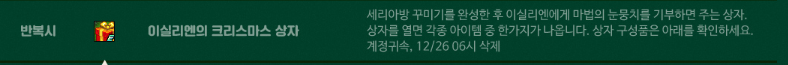 이렇게 보상은 10단계까지 있는데, 이벤트 기간은 꽤나 넉넉하셔서 10단계를 채우고도 마법의 눈뭉치가 남아돌텐데요. 그래서 10단계 이후에 반복해서 마법의 눈뭉치를 이실리엔에게 가져다 주기 되면 이실레인의 크리스마스 상자를 반복 보상으로 받아보실 수 있습니다. 반복 보상이니까 안좋은 보상이겠지라고 생각하실 수 있는데, 나름 좋은 보상들이 들어있답니다.