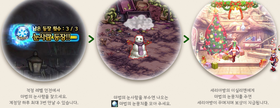 우선 이번 이벤트의 참여 방법은 정말 간단한데요. 적정 레벨 던전에서 피로도 15씩 소모하게 될 경우에는 마법의 눈사람으리 계정당 하루 최대 3번 만나보실 수 있고, 이 마법의 눈사람을 부수게 될 경우에는 마법의 눈뭉치를 획득해보실 수 있습니다. 이 마법의 눈뭉치를 모아서 세리아 방의 이실리엔에게 가져다 주면 보상을 받아보실 수 있는 이벤트 되겠습니다.