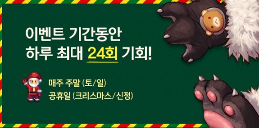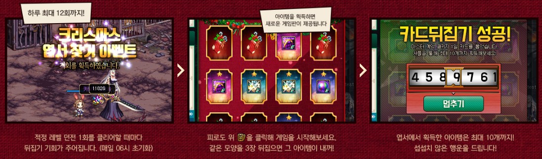 이렇게 적정던전을 플레이하시면 뒤집기 기회를 1번 얻어보실 수 있는데요. 이렇게 해서 하루에 최대 12회까지 뒤집기의 기회를 얻을 수 있어요. 그런데 이벤트가 진행되는 동안 매주 주말인 토요일과 일요일 또 공휴일인 크리스마스와 신정에는 하루 최대 24회까지 뒤집기의 기회를 얻어보실 수 있답니다.