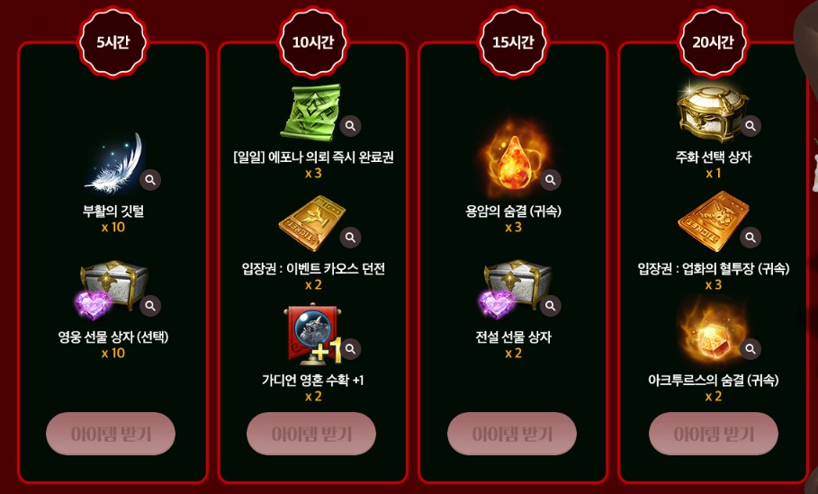 4주차의 보상은 모두 동일하며 5시간 접속시 부활의 깃털, 영웅 선물 상자/ 10시간 접속 시 에포나 의뢰 즉시 완료권, 이벤트 카오스 던전 입장권, 가디언 영혼 수확/ 15시간 접속 시 용암의 숨결, 전설 선물 상자, 20시간 접속 시 주화 선택 상자, 업화의 혈투장 입장권,아크투라스의 숨결을 얻어보실 수 있겠습니다.