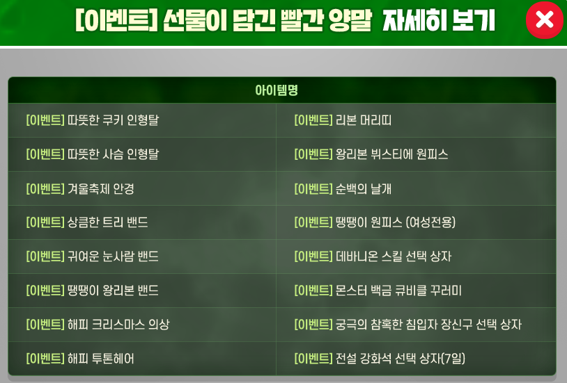 이렇게 획득한 초록 양말에서는 비상 식량, 로다스의 황금별, 인형탈, 은빛별, 소환 주문서, 전설/궁극 마석 선택 상자등의 보상을 획득해보실 수 있고 빨간 양말에서는 인형탈, 안경, 밴드, 의상, 데바니온 스킬 선택 상자, 전설 강화석 선택상자등의 아이템을 획득해보실 수 있겠습니다. 이 외에도 얼어 붙은 양말에서는 인형탈, 쉐이커, 의상등의 아이템을 획득해보실 수 있는데요. 자세한 아이템은 위 사진을 참고해주시면 되겠습니다.