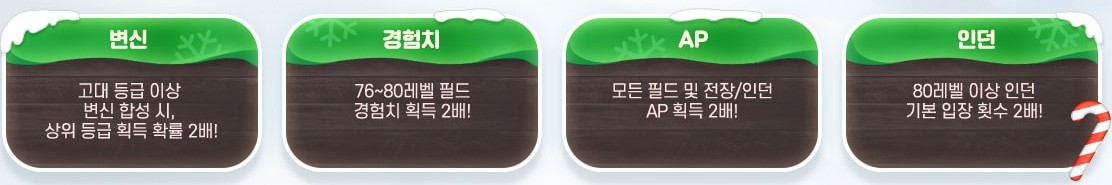 우선 1번째는 고대 등급 이상 변신 합성을 할 시에는 상위 등급을 획득할 확률이 2배 증가, 2번째는 76 ~ 80레벨 필드 경험치 획득 2배, 모든 필드 및 전장/인던 AP 획득 2배, 80레벨 이상 인던 기본 입장 횟수 2배 이렇게 총 4가지의 커블이 이번 이벤트 기간 중에 적용되니 이를 확용하셔서 플레이해보시길 바랍니다.