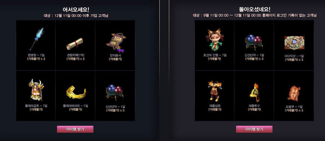 이렇게 신규 유저에 해당하시면 현명창, 경험치책, 전직증서, 황제의갑옷, 황제의머리띠, 신선단약을 획득해보실 수 있고, 복귀 유저에게는 호선의 인형, 신선단약, 다다익선, 대황갑옷, 태황투구, 도발부를 획득해보실 수 있답니다.
