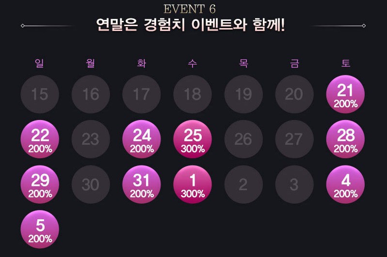추가로 연말은 경험치 이벤트와 함께 이벤트가 진행되는데요. 우선 주말과 휴일인 25일과 1월 1일 전날에는 경험치 200% 혜택이 적용되고, 크리스마스와 신정인 12월 25일과 1월 1일에는 300%의 경험치 혜택을 받아보실 수 있겠습니다.