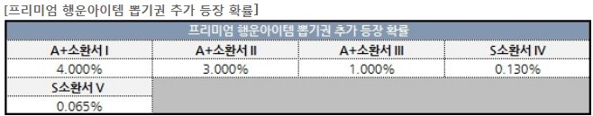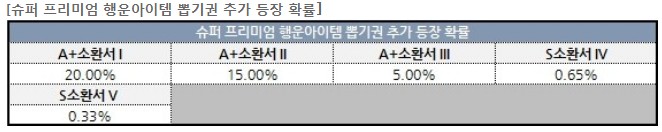 소환서가 나올 확률을 보자면 소환서 1 ~ 3까지는 그래도 슈뽑으로 나름 잘 나오는 정도인데, 신규 행템이여서 그런지 소환서 4 ~ 5까지의 얻을 확률이 슈뽑에서도 정말 낮기 때문에 획득해보시기는 정말 힘들 것 같은데요. 이번 행템은 이벤트가 단순하지만 난이도는 정말 어려울 듯 합니다.
