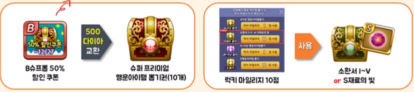 그래도 이번에 이벤트 메뉴 할인시 슈프뽑 50% 할인 쿠폰이 지급되고, 이번에 10점 마일리지를 통해서 소환서 1 ~ 5까지 or 재료의 빛 뽑기권을 지급하고 있으니, 이번 이벤트에 참여해보실 분들은 이런 혜택들을 잘 활용하셔서 이벤트를 저격해보시는 것이 좋을 것 같네요.